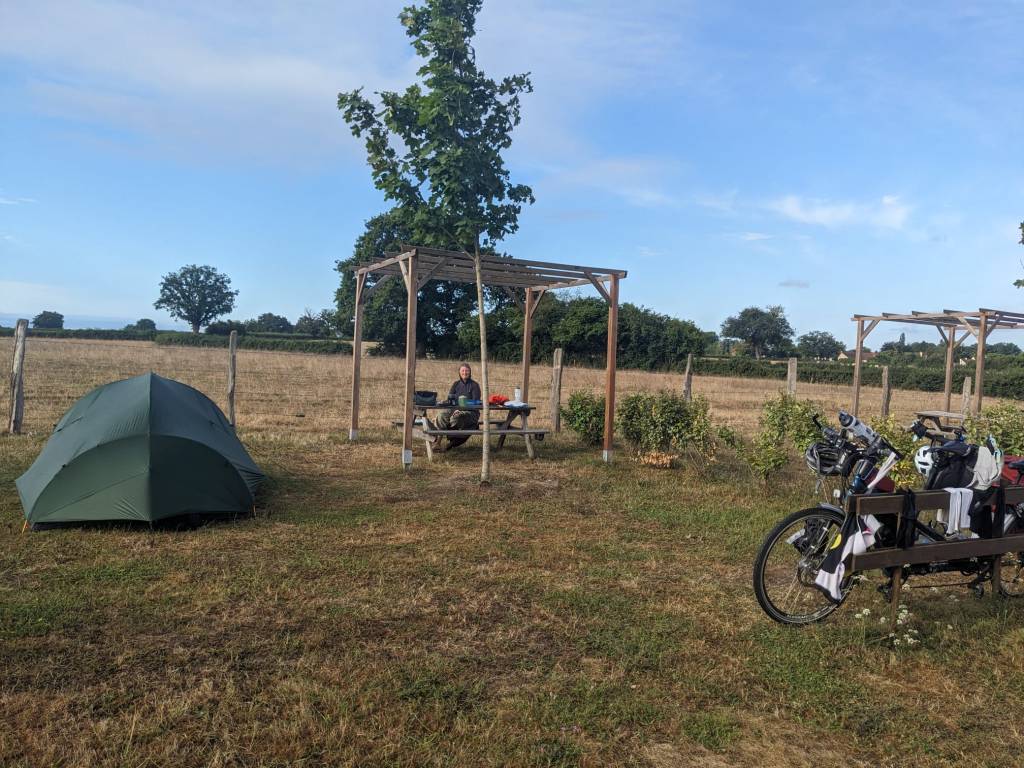 But also, especially along the Loire, they have had a small, but focussed and dedicated area for welcoming cyclists. One of our favourite campsites so far (Lac du Palinge) put all the cyclists away behind a hedge from the camper van families – meant a longer trip to the loo in the night, but plenty of peace and quiet. At least until we were woken by the Charolais cows returning from milking, happily mooing the last sleepy cyclists awake. Each campsite (carefully demarcated of course) had its own table, a mini-pergola, a nice wooden structure to lean the bikes against, and crucially a pair of power outlets. Water tap was shared with our neighbours.