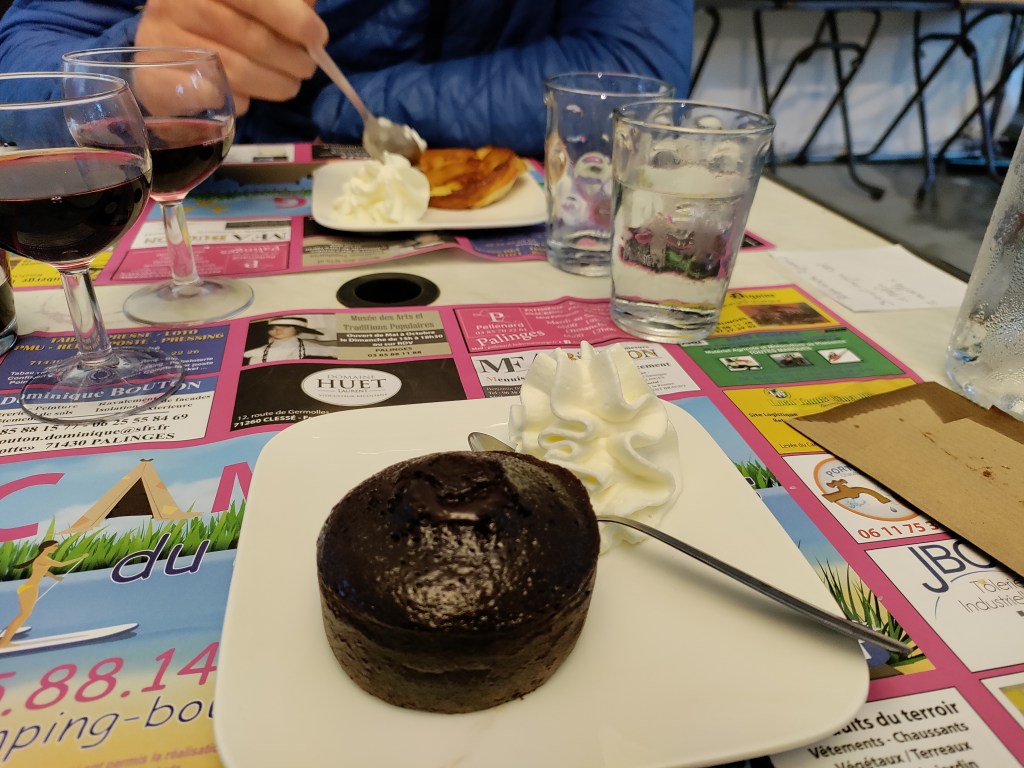 But above all, it’s the food options that are the most astounding to me. Some campsites have a drink and snacks bar on site. Others arrange for a food truck to be stationed nearby. We’ve had steak on a hot rock, followed by dessert (at one of our favourites, Lac du Palinge), with had a cheese board that was nicer than we can get at home near Saumur, we had breakfast – bread, jam, tea, coffee and juice served in Saint-Florent-Le-Vieil.