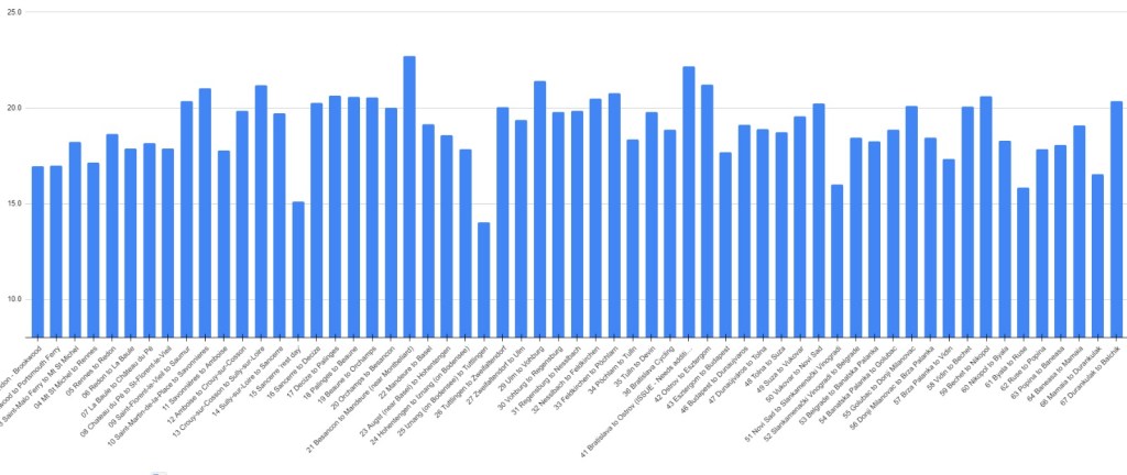 Our average moving speed was 19.3km per hour. Below you can see our average moving speed each day – the dips correspond with the hilly days.
