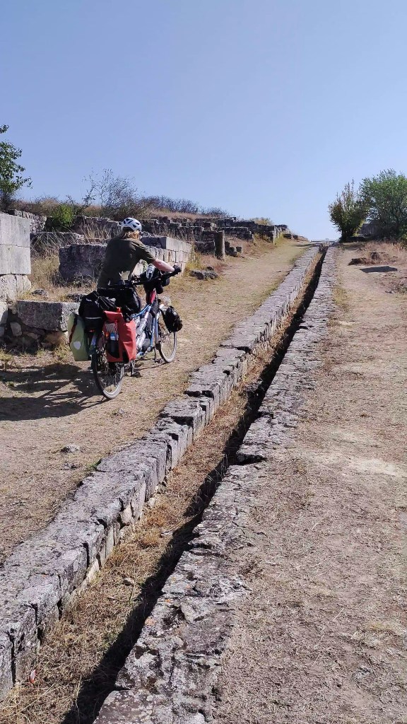 In Bulgaria, we were cycling on a rough back road, over some hills and through the forest, and Robin comments that the locals call this the Roman road. I replied back that I thought it could be a Roman road, and Robin’s replied, ‘that Roman roads usually have ditches on either side of them’. I told him to look up from the road and pointed out the two dips on either side of the road in the forest about half a metre from the edge of the road on both sides.